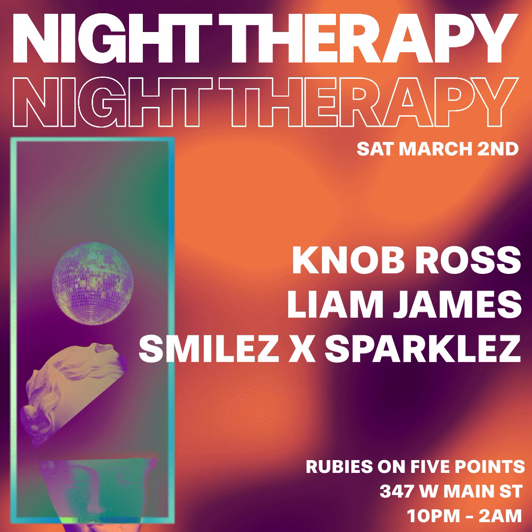 At Night Therapy events, you’re prescribed to lose yourself on the dancefloor, to get lost in the music. To emulate that, we play with visual elements of vaporwave and surrealism in our social media promotion and brand colors.