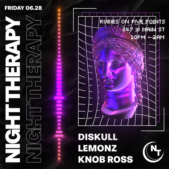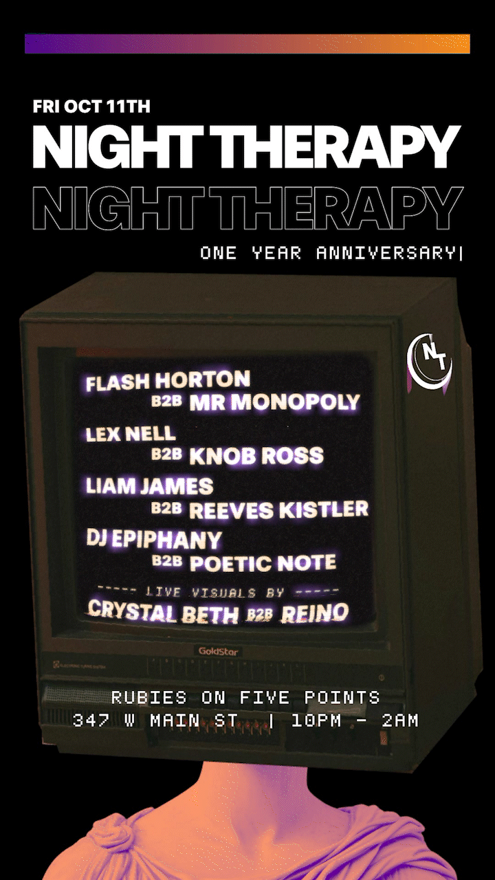 Based out of Raleigh, NC, Night Therapy is an event-production company that creates immersive dancefloor experiences through interactive art, visuals, projection mapping, and curated line-ups.